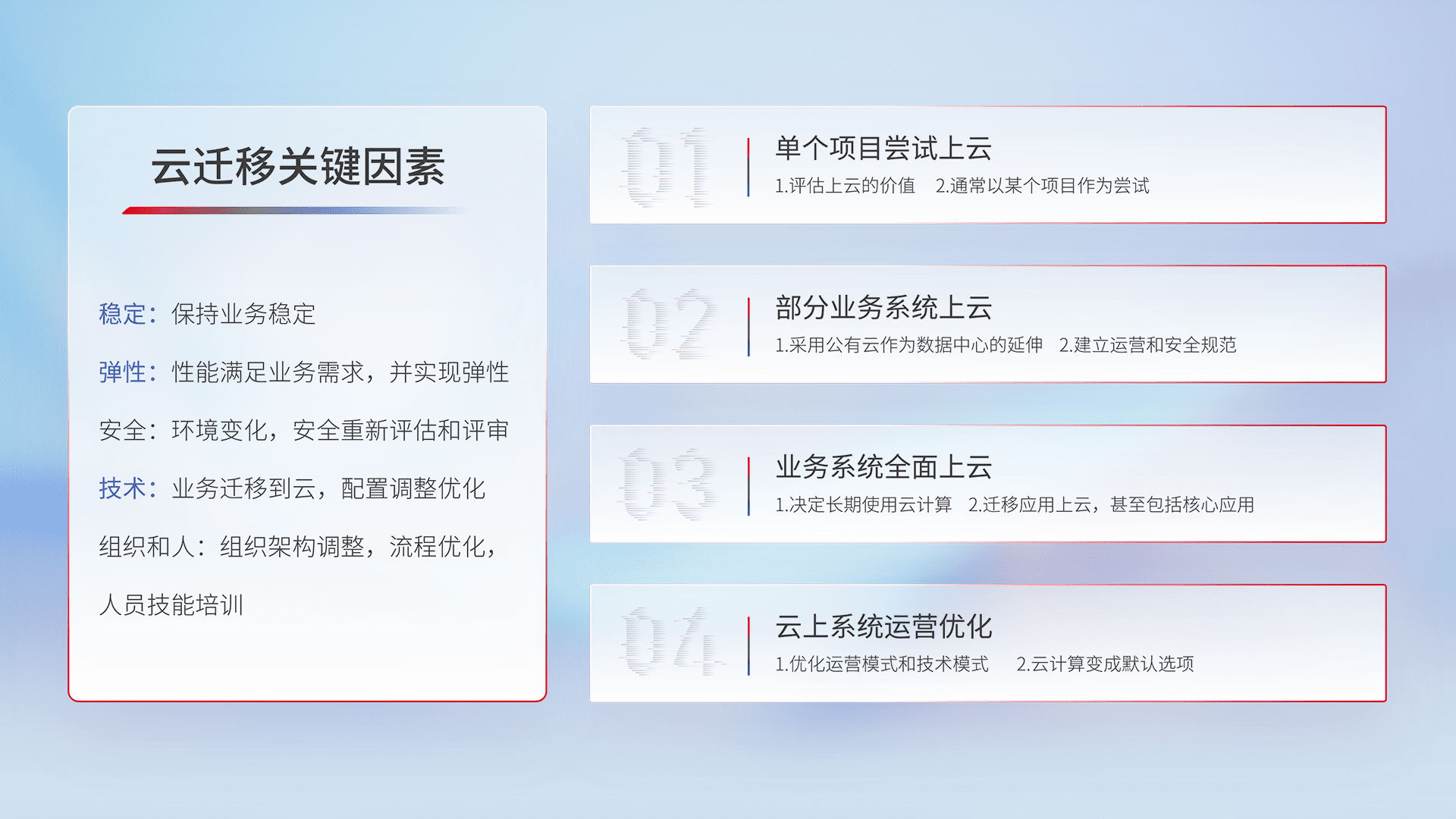 结合实际业务,,,,从规划设计、、、、云平台选型、、、云原生改造、、、、数据迁移、、集成交付,,迁移全过程为客户识别最佳上云路径,,做好风险识别管理,,设计网络架构、、、身份权限、、、、安全审计合规、、、操作审计、、、日志审计、、监控告警策略、、、、多站点容灾设计等,,,,对云上基础设施进行整体规划,,,,提升IT治理水平,,,以满足弹性、、、高可用、、、、高性能的需求。。