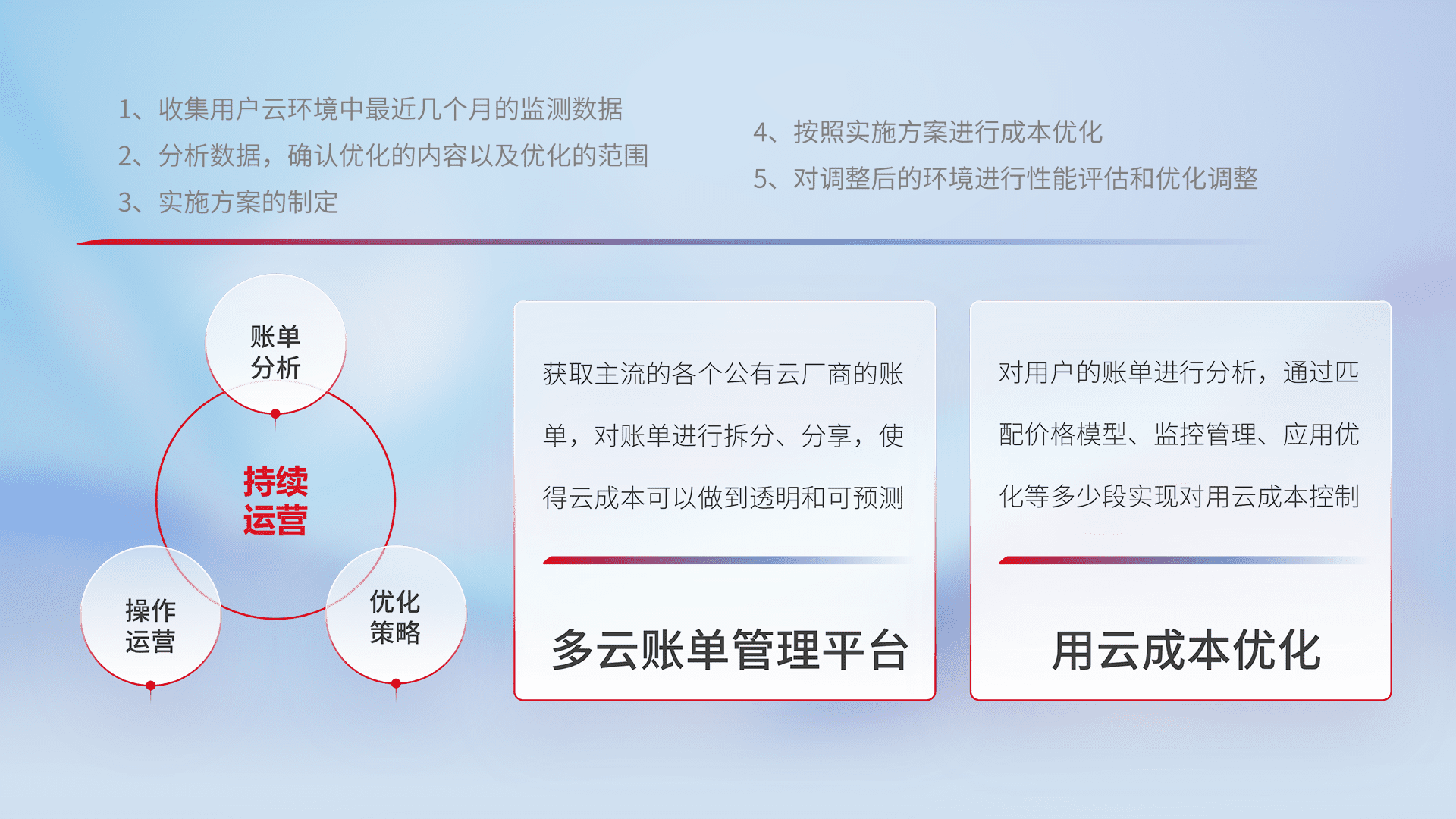 通过灵活运用多种自动化迁移工具,,,,帮助企业用户实现业务和数据高效 、、、稳定的上云迁移和云上迁移,,,,采用自研多云纳管平台,,,以中立管理模式,,,解决多组织、、、、多云、、多运维厂商的复杂关系的管理,,保证多云平台资源配置的一致性,,,,实时掌控云资源运行数据,,,运用智能化工具分析云资源多云平台的管理服务,,,透明化管理成本支出,,,用云成本可预测、、、、用云费用可优化、、云资源配额有据可依。。。